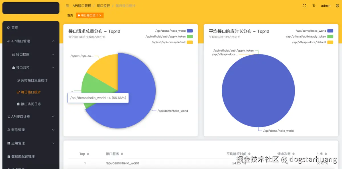 - 账号分布:当前平台个人开发者、企业开发者、普通管理员和超级管理员的账号数量分布和丙图统计。