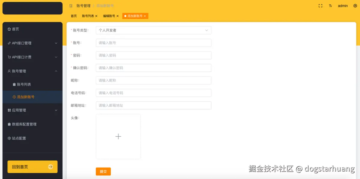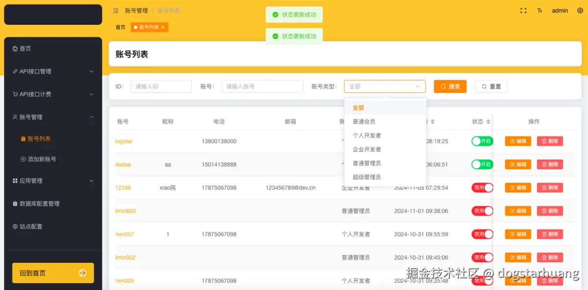 账号的查看和管理,包括:开发者账号、管理员账号、普通用户账号等。也可以在管理后台直接添加新账号、重置密码、禁用账号等操作。