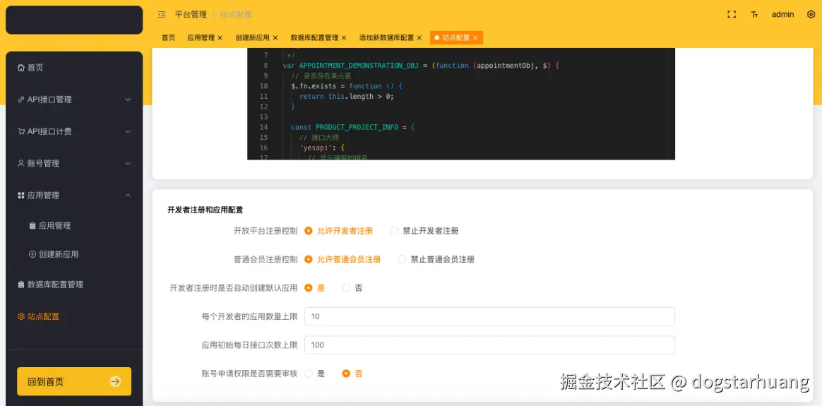 - 开发者注册和应用配置:开放平台注册控制、普通会员注册控制、开发者注册时是否自动创建默认应用、每个开发者的应用数量上限、应用初始每日接口次数上限、账号申请权限是否需要审核等配置管理。