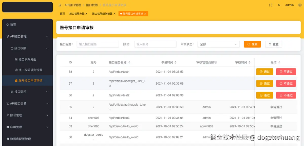 在【账号接口申请审核】,管理员可以针对开发者申请的接口权限进行审批或拒绝。管理员点击【通过】可以审批通过权限的申请,点击【不通过】则拒绝。审批结束后将会显示审批的结果,例如:申请通过/申请不通过。