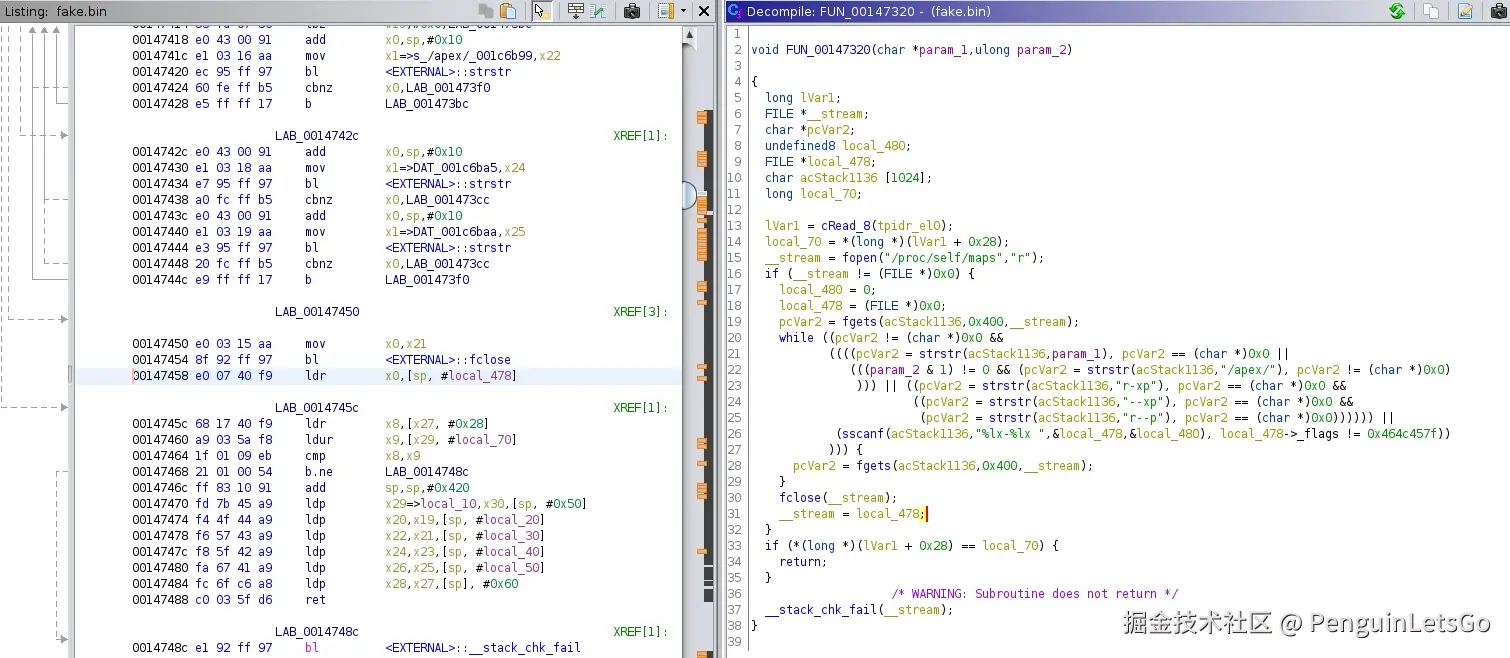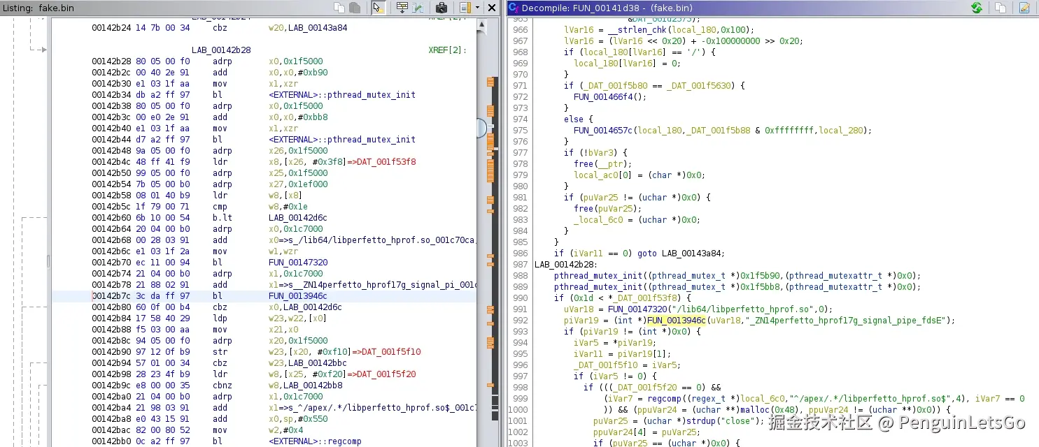 此处对应的是 Native#1 的伪代码,显然是想通过 FUN_00147320 来获得 libperfetto_hprof.so 的加载首地址。然后计算符号 _ZN14perfetto_hprof17g_signal_pipe_fdsE 的偏移地址。