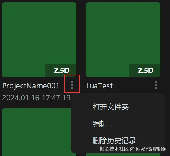 如果曾经打开过任意项目,下次进入编辑器就会在【我的项目】看到这些项目,双击即可进入。 也可以通过右上角的打开选项,选中项目文件夹里的header.project文件,启动任一项目。