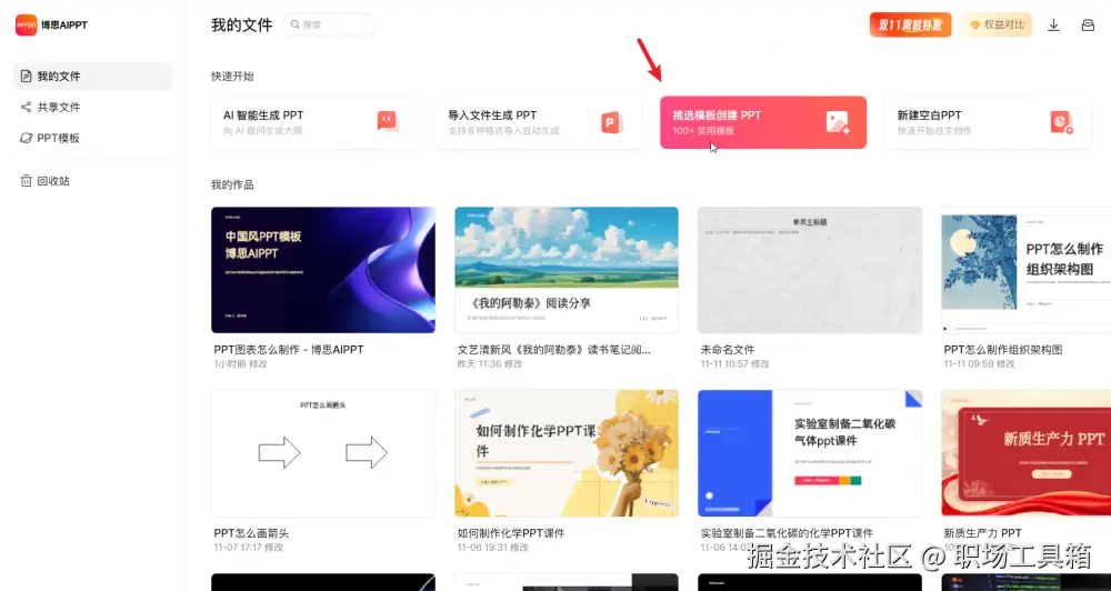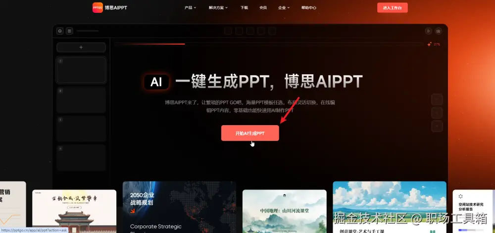 首先,在浏览器访问博思AIPPT的首页,找到右上角的 “进入工作台” 按钮并点击,打开博思AIPPT的工作台。