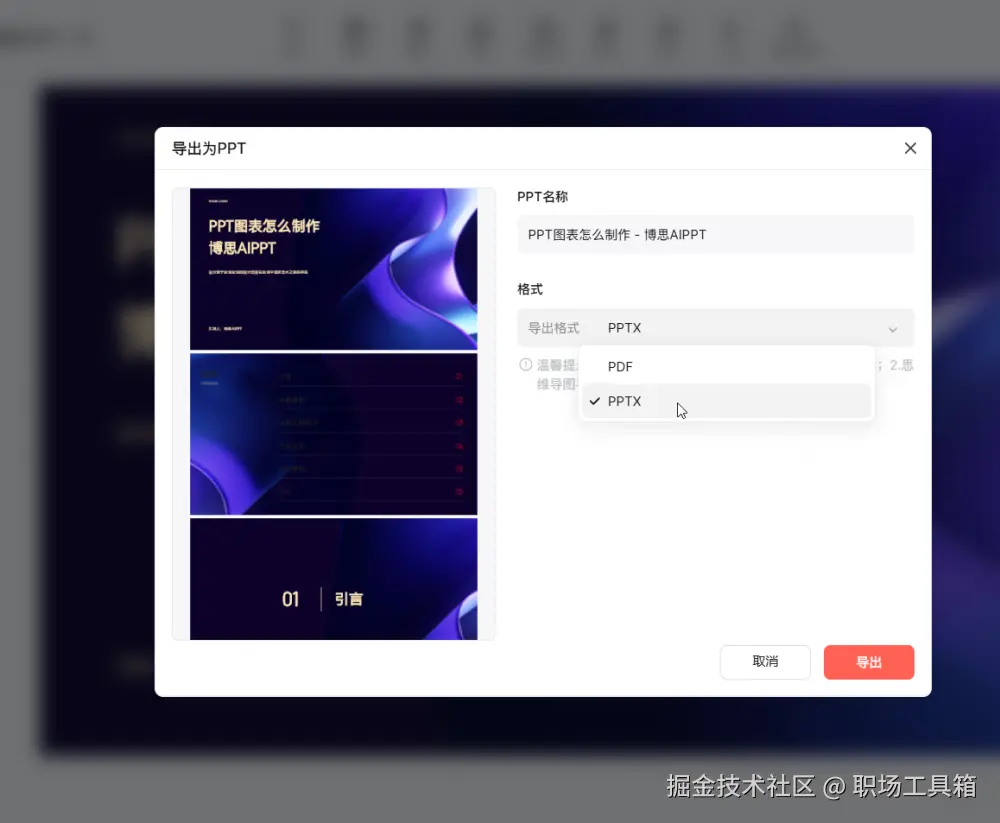 完成图表制作后,你可以将整个PPT导出为多种格式,包括PDF、PPTX等。这样你可以根据自己的需求选择合适的格式进行保存和分享。博思AIPPT还提供了直接分享演示链接的功能,观众无需下载即可查看。这对于需要快速分享PPT的人来说非常方便,可以大大提高工作效率。