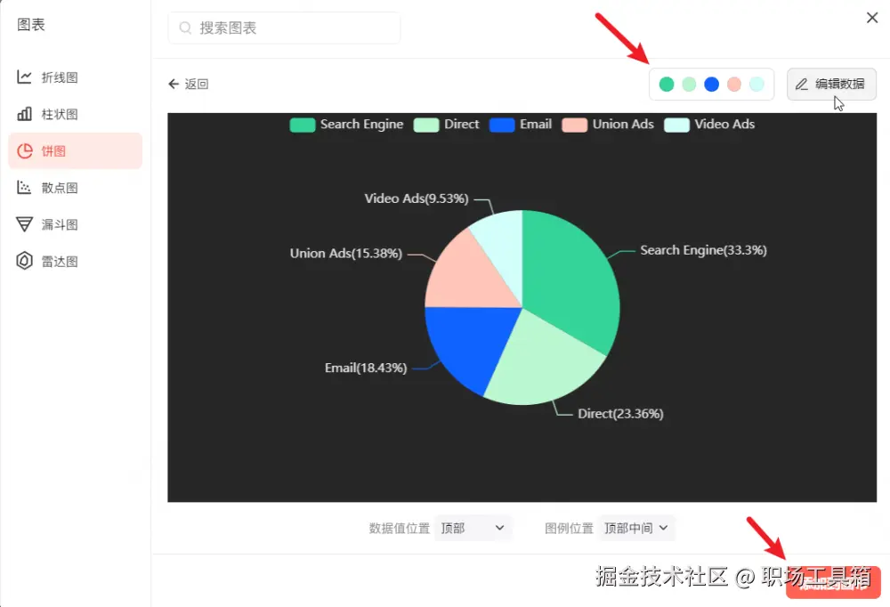 将鼠标指针移动到PPT图表上方,点击使用,会进入到下图的编辑界面,点击右上角的拾色器、编辑数据,可依次调整PPT图表的配色和数据,调整后下方的PPT图表会实时刷新,所见即所得。