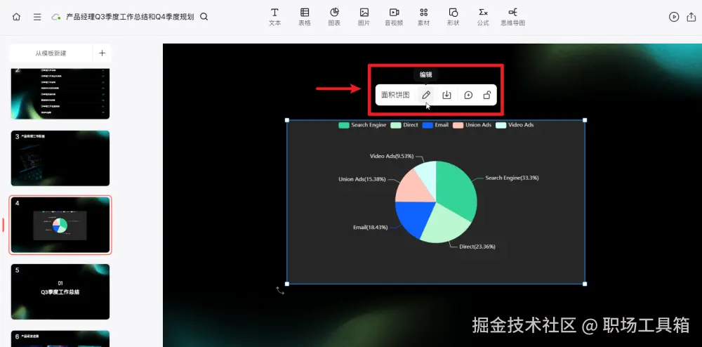 做好的PPT图表添加到画布后,如果需要改动或编辑,可选中PPT图表,点击工具栏的编辑按钮,重新进入PPT图表的编辑状态。