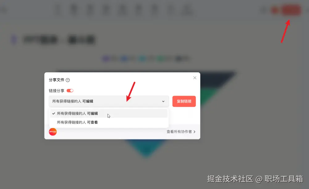相比Office PPT,博思AIPPT还标配了当下流行的在线协作功能,你可以点击右上角的分享按钮,获取 PPT链接,然后邀请同事或客户查看并评论图表。这样,你可以根据他人的反馈进行实时调整,无需反复导出和重新上传文件。