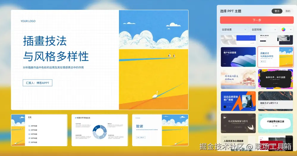 智能排版:自动优化页面布局,确保PPT的美观和专业性。博思AIPPT能够根据内容的逻辑结构和重要性,自动调整文字、图片、图表的布局,使PPT的整体结构更加清晰合理。同时,它还提供了多种预设的配色方案,涵盖商务、教育、科技等不同风格,用户可以根据自己的需求进行选择。