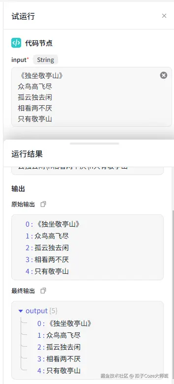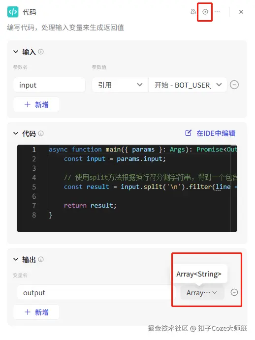 修改输出类型为字符串数组,并点击测试: