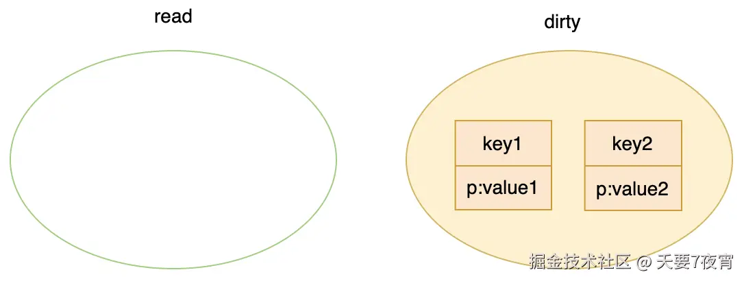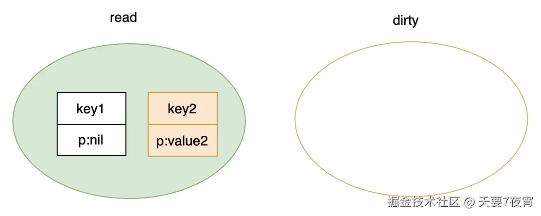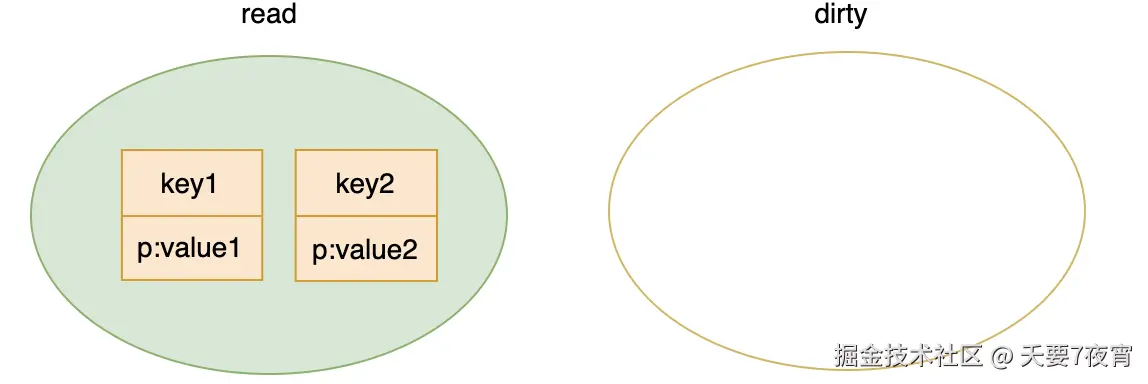 - 在一个空的map中加入两个元素假设为key1/value1和key2/value2,由于新加入元素,只会去dirty里面加入,所以加入完了以后,read还是空,dirty含有两个key,key1和key2