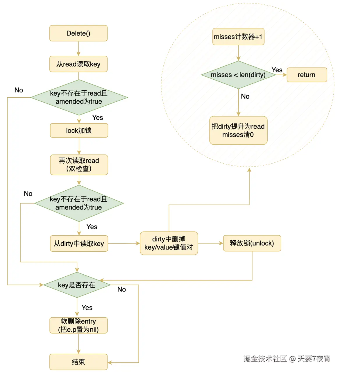 Delete方法是从sync.Map中删除一个元素,delete方法也很简单,还是优先检查read,若key在read中存在,则只会操作read。若在read中不存在,回去dirty中删除这个键值对delete(m.dirty, key)。所以分两种情况讨论: