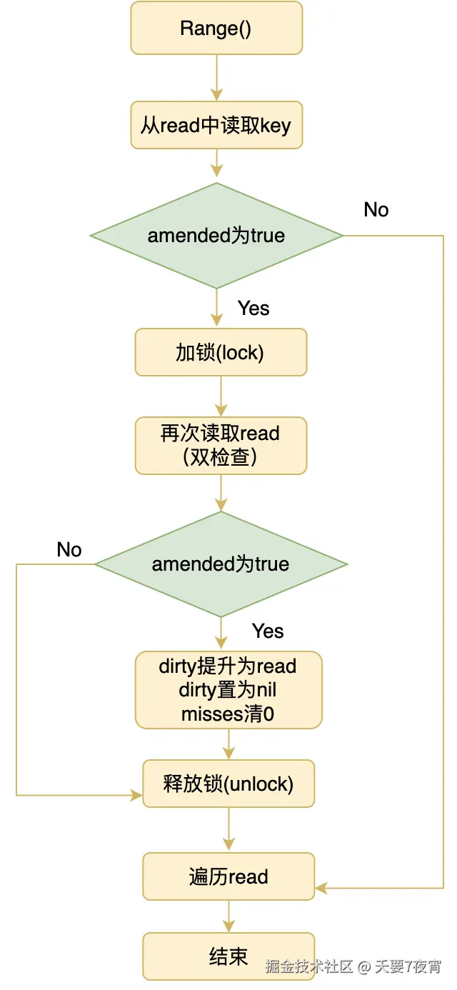 在sync.Map中当dirty不为nil时,dirty会包含map中所有非删除的key。在遍历的时候会先看read的amended字段,当amended为true时,表示dirty中有read中没有的字段,将dirty提升为read,在遍历read即可,这样就避免了访问dirty会加锁导致性能低下,如果amended为false时,表示read和dirty中的key一致,这时直接遍历read即可。