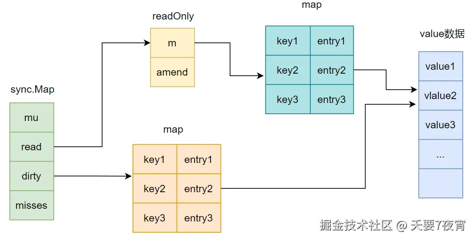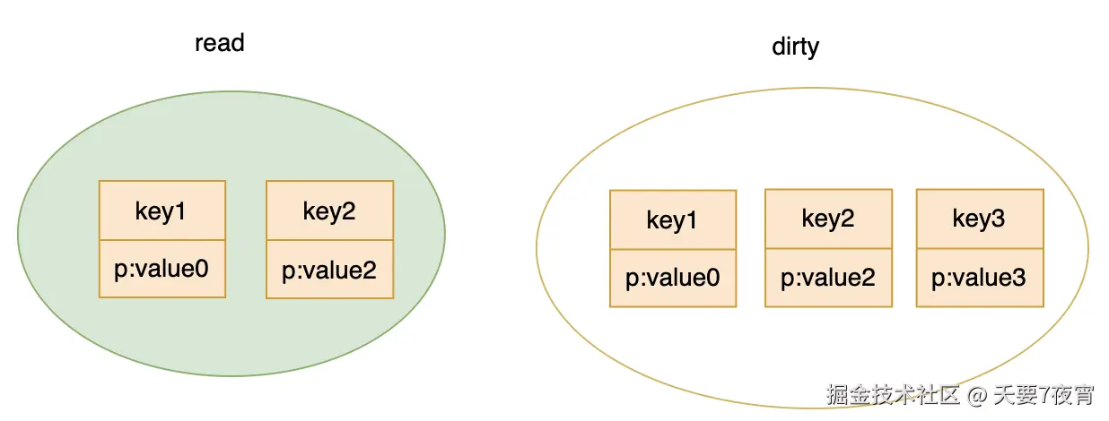 这里其实很巧妙,在dirty和readOnly里面的两个map的value并不是一个对象,而是一个指向任意类型的对象的指针,所以,在这两个map都非空的情况下,map的read字段和dirty字段会包含相同的数据项,如果通过read字段更改了这个项的值,dirty字段会读取到这个项的新值,因为它们指向的是同一个地址