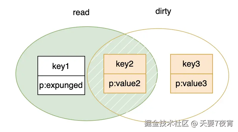- p==expunged,当前key存在于read,但是key不存在于dirty,dirty也不为空,read包含dirty中不存在的key,dirty也包含read中不存在的key,这种情况下p的值为expunged,形式如下图。在这种情况下,不能单单只操作read,还要加锁同步更新dirty,将这个key加入到dirty中,将e.p的保存新传入的value