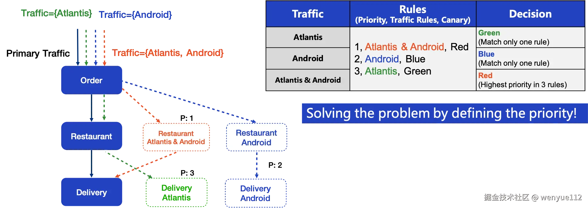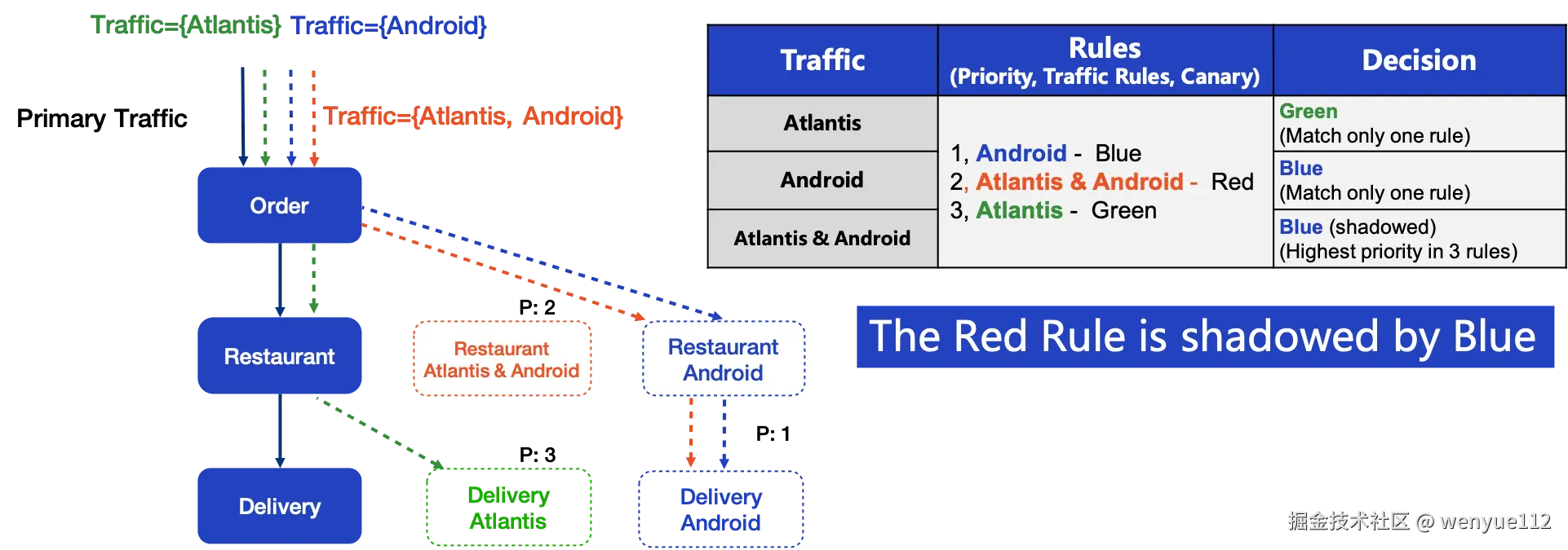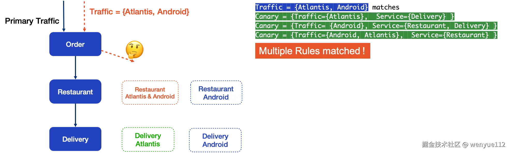解决这个问题的一个简单易行的方法是指定灰度规则的优先级。每个流量规则都有一个数字表示优先级,数字越小优先级越高。从图中可以看出,Traffic Atlantis & Android 匹配了三个灰度规则,但由于餐厅灰度的 Atlantis & Android的优先级最高,即优先级为1,因此红色Canary被选中。