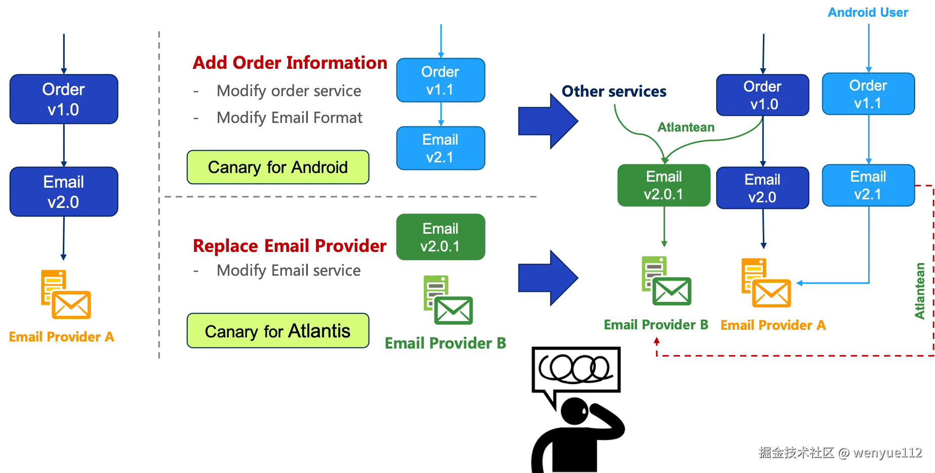 然后,另一个团队决定在电子邮件服务中用电子邮件提供商B取代电子邮件提供商A,所以我们添加了电子邮件v2.0.1,只为测试来自Atlantis的用户。
