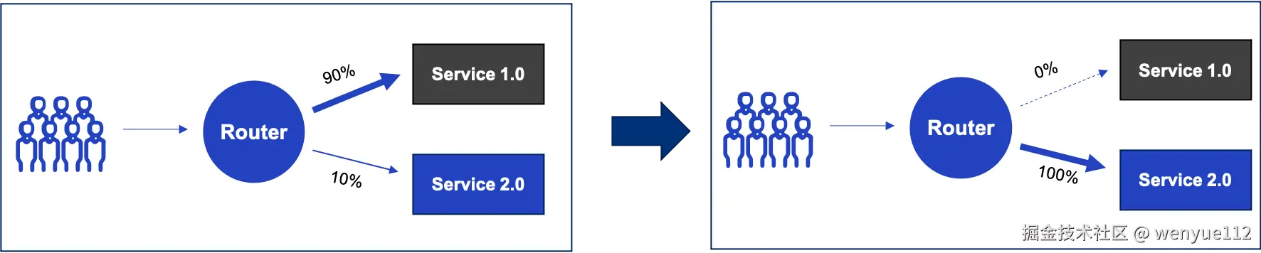 让我们从最简单的情况开始。灰度发布又叫金丝雀发布,是一种发布技术,用于减少软件新版本发布的风险。其想法是首先向少数用户发布新版本的软件,然后逐步扩大用户比例。例如,在这个图中,我们先测试10%的用户,然后逐渐将更多的用户转移到新版本,最后,当所有的用户都使用了新版本,那么旧版本就可以被清除并下线。