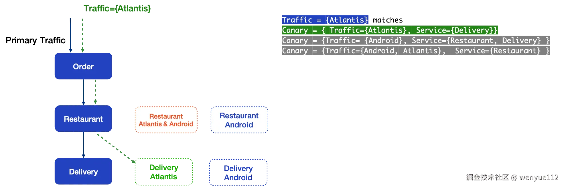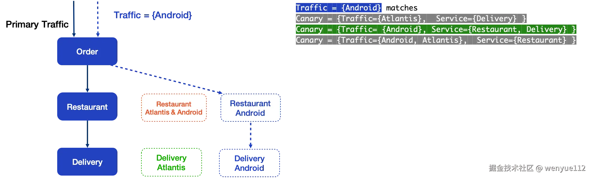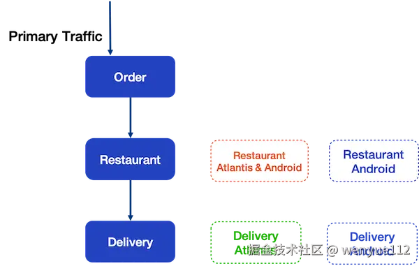另一边,带有Android用户标签的流量与灰度的餐厅和配送的路由规则相符。该流量遵循蓝色虚线路径。