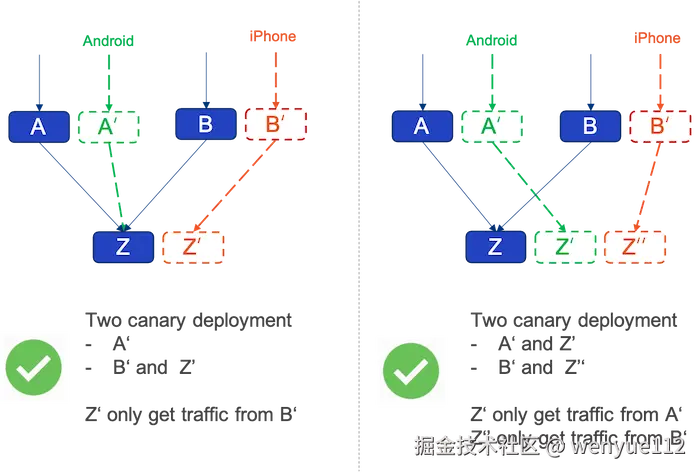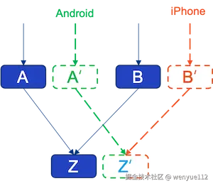 例如,A和B依赖Z,而A'测试Android流量,B'测试 iPhone 流量,他们测试的是两个不同的用户群,如果他们都依赖Z'来测试,Z'承担了两个不同的灰度流量,将成为混乱的根源。