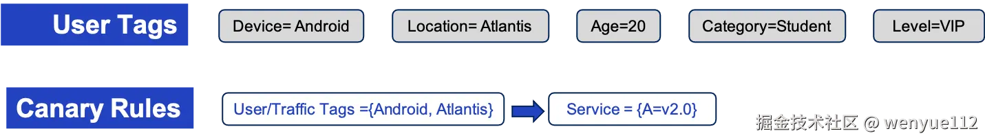 然后我们可以指定灰度流量规则,将用户的某一部分流量调度/路由到某个灰度版本上来,例如,来自Atlantis的Android用户被调度到服务A的2.0灰度版本。