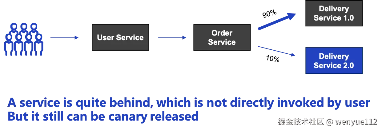如图所示,我们已经为配送服务发布了灰度版本,但是用户和订单服务在配送服务的前面。在这种情况下,我们需要做两件事,以确保流量被正确调度。