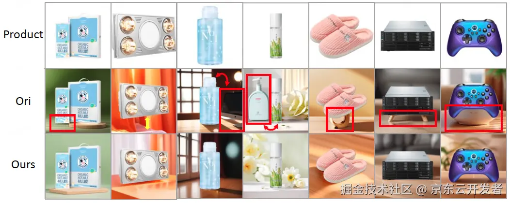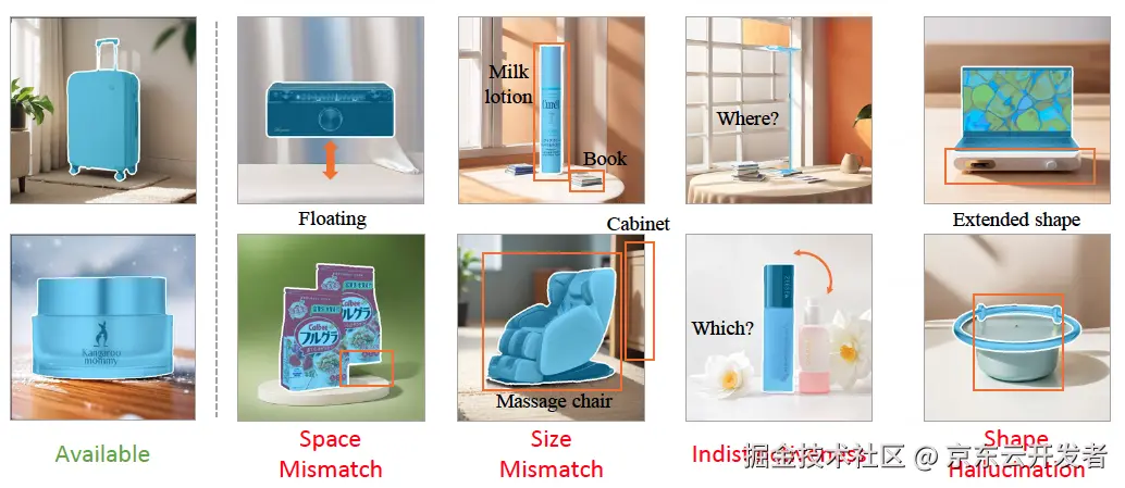 尽管生成模型有潜力创造出吸引人的背景,但我们观察到其经常会生成质量欠佳的广告图片,如下图所示,这些图片存在空间和尺寸不匹配、不显著以及形状幻觉等问题。