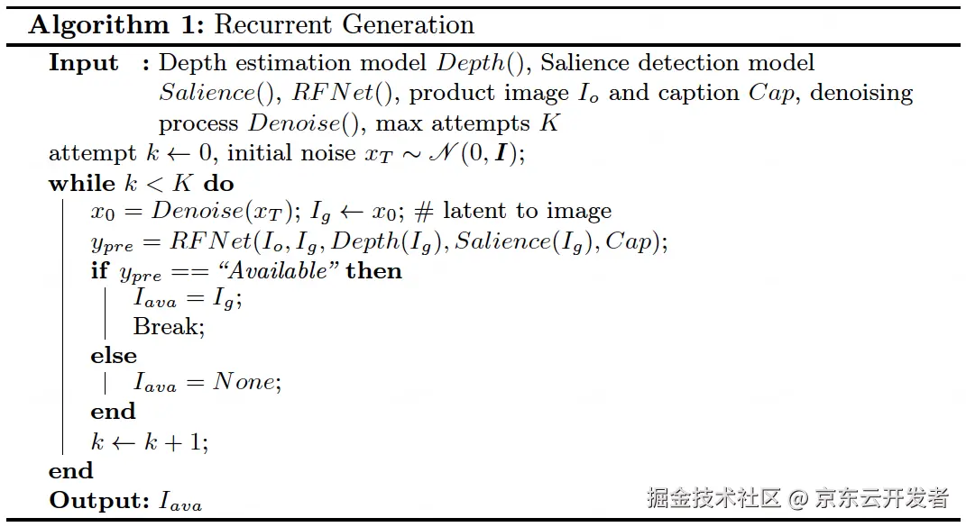 通过使用RFNet判别生成结果,可利用随机性提升可用率。我们将这种提升可用率的方法称之为循环生成,伪代码如下所示: