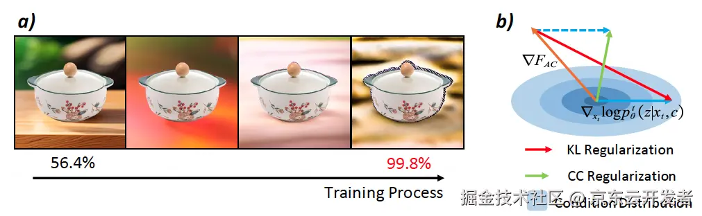 尽管通过梯度反传微调能够提升合格样本出现的概率,然而由于图像可用率和美观度是对抗的目标,这使得提升图片的可用率会导致美观度的下降。例如,直接将商品放置于空白背景中将获得极低的bad case比例,然而这种方式将严重破坏图片的美感。如下图(a)所示,随着模型达到极高的图片可用率,商品的背景区域将产生美学崩塌的结果。