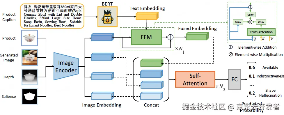 一个自然的解决方案是利用生成过程中的随机性,反复生成图像直到获得可用的图像(循环生成)。为了替代人工检查,我们提出了一种新颖的信赖反馈网络(RFNet),充当人工检查员来评估生成的广告图像的可用性。由于仅依赖单一生成的图像,模型无法有效获得进行精确检查所需的关键知识,例如产品是什么以及产品如何出现在背景中。因此,RFNet整合了多种辅助模态,以提供对判断不同不可用情况至关重要的信息。RFNet的结构如下所示: