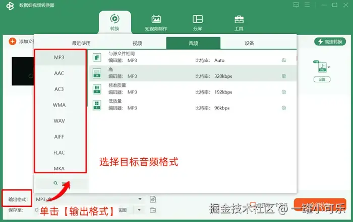 步骤2:在音频文件转换列表下方,单击 【输出格式】 文字,进入格式选择页面,选择目标音频格式。