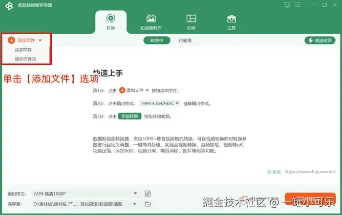 • 步骤1:打开数据 蛙视频转换器并运行,选择格式转换界面,单击 【添加文件】 选项,将视频文件上传到格式转换界面。
