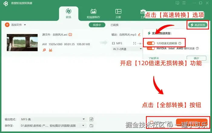 • 步骤3:返回格式转换界面,单击界面右上角的【高速转换】选项,开启 【120倍速无损转换】 功能,再点击下方的【全部转换】按钮,等待文件格式转换完成即可。