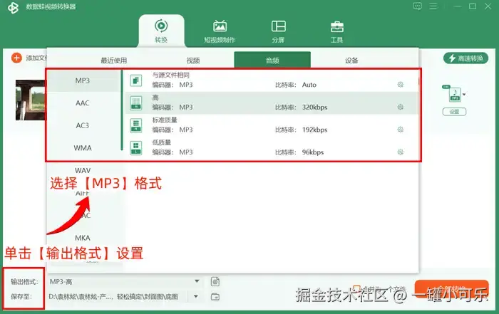 • 步骤2:在格式转换列表下方,单击 【输出格式】 设置,在其弹出的格式选择列表中,选择音频格式列表下的 【MP3】 格式。