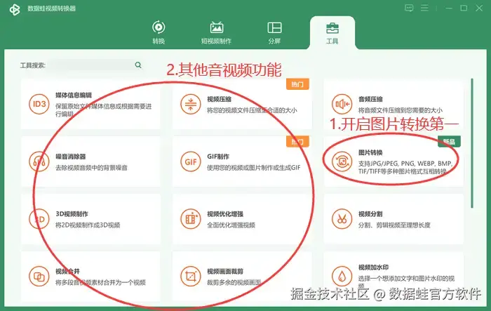 步骤1: 打开数据 蛙,点击 【工具】 界面后,选择 【图片转换】 功能,开启图片转换第一步。