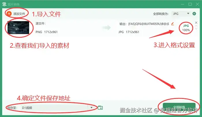 如果你的转换需求较为复杂,在线转换网站无法满足,可以使用数据 蛙视频转换器这款优秀的jpg格式图片转换器。数据 蛙视频转换器支持快速且高效的png到jpg的转换,能够优秀地完成在线图片转换格式任务。在转换过程中,软件会尽可能地保持原始图像的质量,确保转换后的jpg图像清晰且不失真。软件还支持一次性选择多个png文件进行批量转换,大大提高了工作效率。