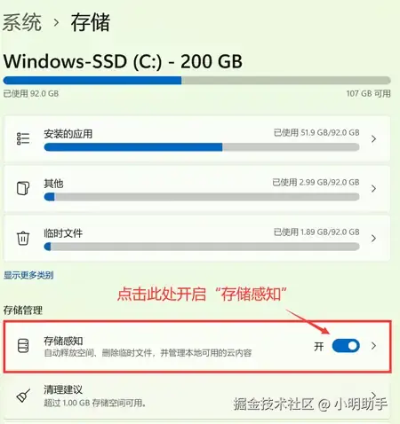 为了预防C盘又会有新的垃圾文件存进去,用户也可以选择开启“存储感知”功能,让电脑自行判断垃圾文件后自行删除。电脑C盘空间怎么清理?打开存储感知清理C盘的步骤如下: