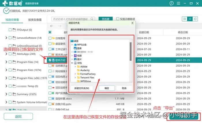 步骤3: 选择自己需要恢复的文件后,点击“导出”,最后在“浏览文件夹”中选好恢复文件的存储位置。
