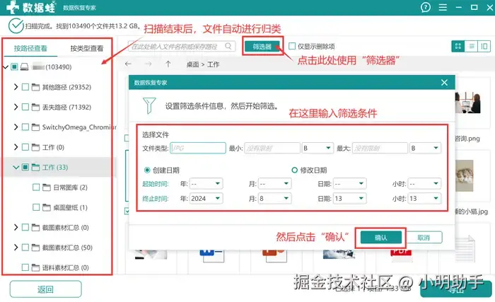步骤2: 在扫描结束后,建议使用“筛选器”,设置好目标文件相关的详细信息条件后,能够帮助用户更快地找到目标文件。