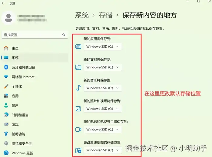 为了延长清理C盘的周期,我们还可以打开设置,更改新数据写入时候的默认存储路径。电脑C盘空间怎么清理?打开电脑的“设置”,点击“系统”后再点“存储”,选择“保存新内容的地方”,在里面更改默认存储到C盘的选项即可。
