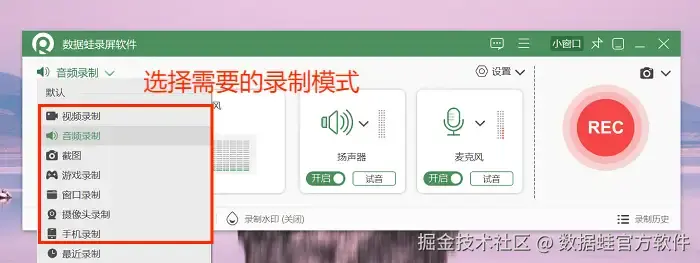 步骤1: 如何录音?点击并打开数据 蛙录屏软件,然后在软件的主页面选择合适的录制模式,本文以 “音频录制” 模式为例。