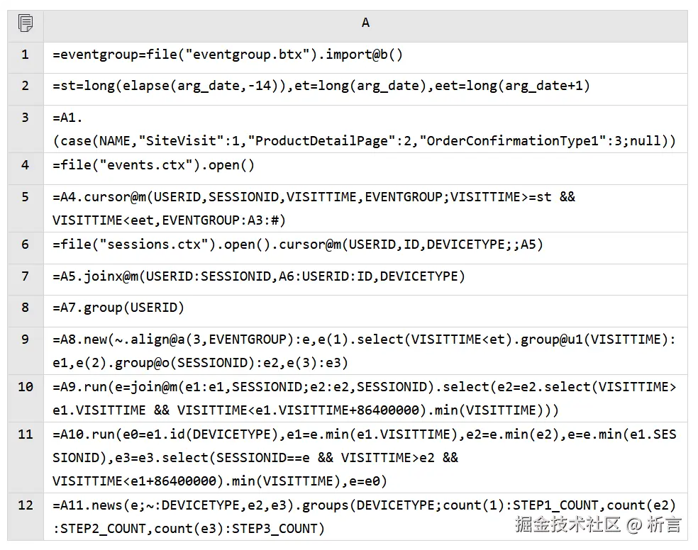 A8 每次读入一个 ID 的所有事件,然后用 A9 到 A12 四句代码实现复杂判断逻辑,最后 A12 分组统计时也只要简单计数就可以了,不用再考虑去重了。