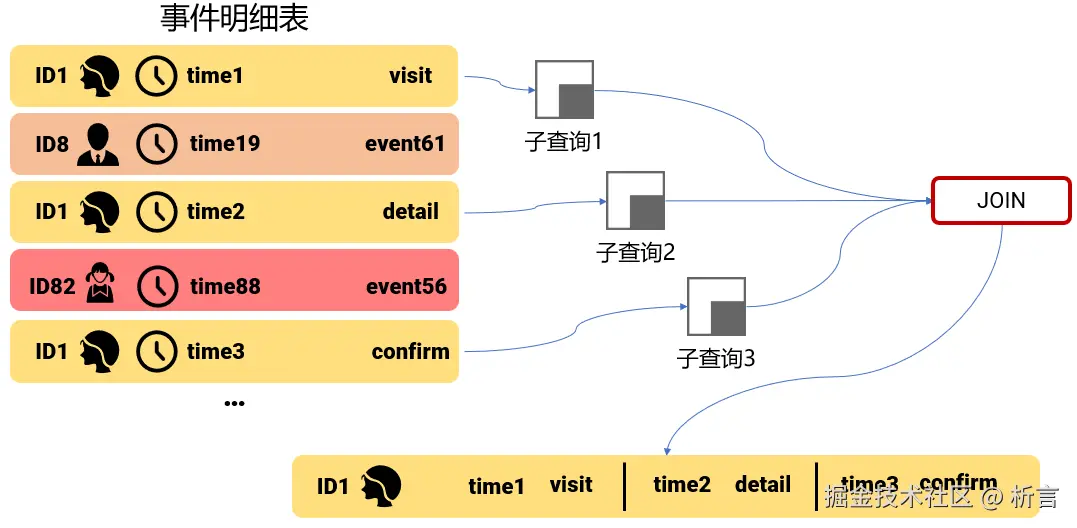 比如下图中的三步漏斗,就涉及 ID1 的多条记录,先用多个子查询筛选合适的事件记录,把多行记录 JOIN 到一行中,才能做进一步运算。