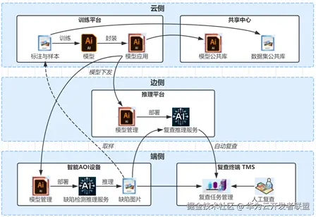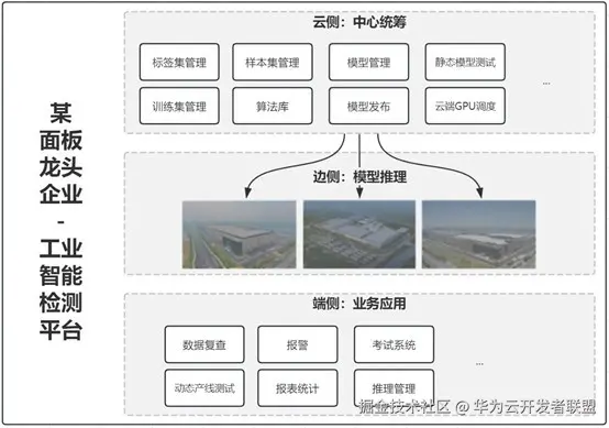 工业智能检测平台将 ADC 作为核心,扩展至模型训练和检测复判,实现“云”(管理+训练)+“边”(推理)+“端”(业务)的一体化方案,旨在通过标准化平台提高生产质量和数据价值。建设范围包括资源共享中心、现地训练和边侧推理等子平台,将在若干工厂实施。