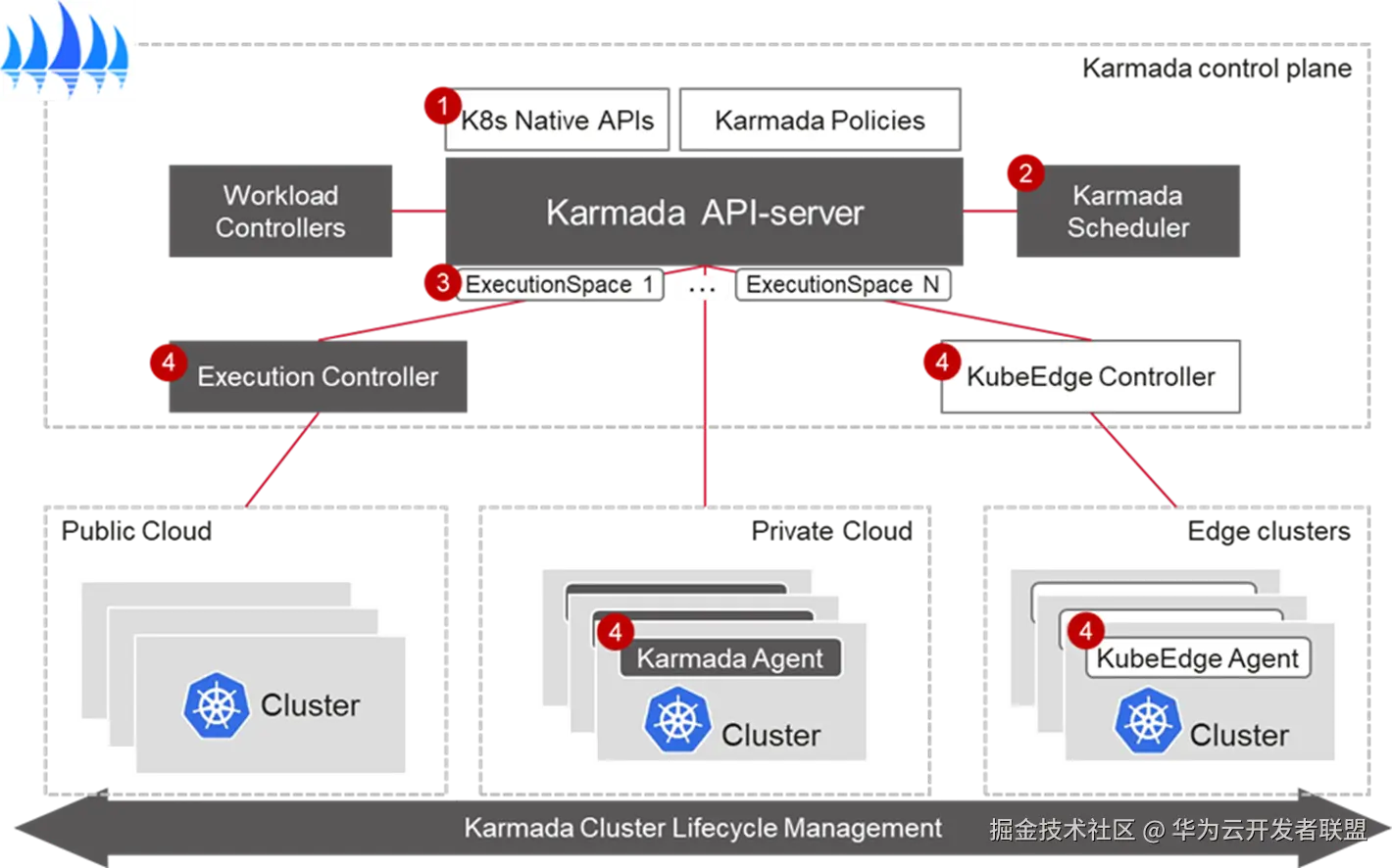 为了解决上述挑战,华为于2021年正式推出了开源项目Karmada,旨在打造一个云原生的多云容器编排平台。Karmada(Kubernetes Armada,舰队之意)继承并超越了社区Federation v1和v2(kubefed)的设计理念,它不是简单地在不同集群间复制资源,而是通过一套全新的API和控制面组件,实现了在保持Kubernetes原有资源定义API不变的前提下,无缝地在多云环境中部署和管理分布式工作负载。
