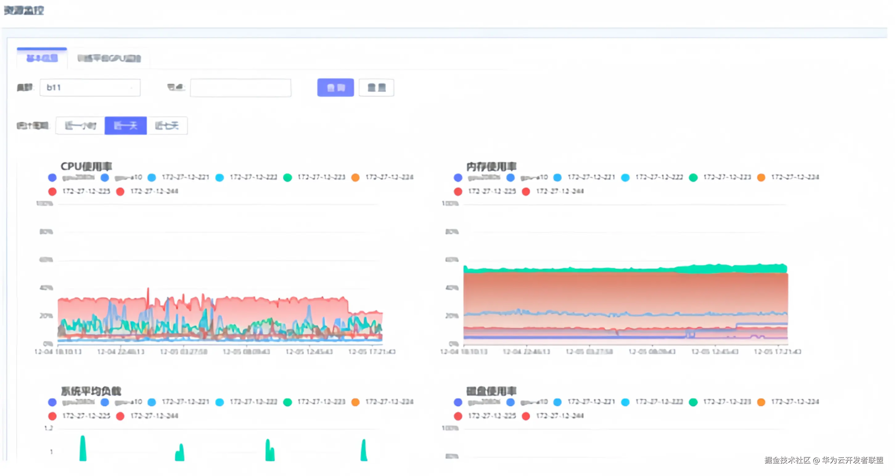 针对在线的集群,中心云系统可对内存、CPU、磁盘、网络流入流出速率、GPU、日志等指标进行监控数据展示,并可切换集群进行数据查看。