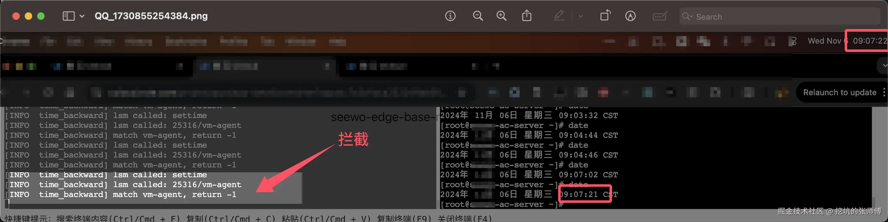 这样实现以后,就有效阻止了 vm-agent 的修改时间操作(下面是一个模拟的、假的名为 vm-agent 的程序去设置时间的操作被拒绝)。