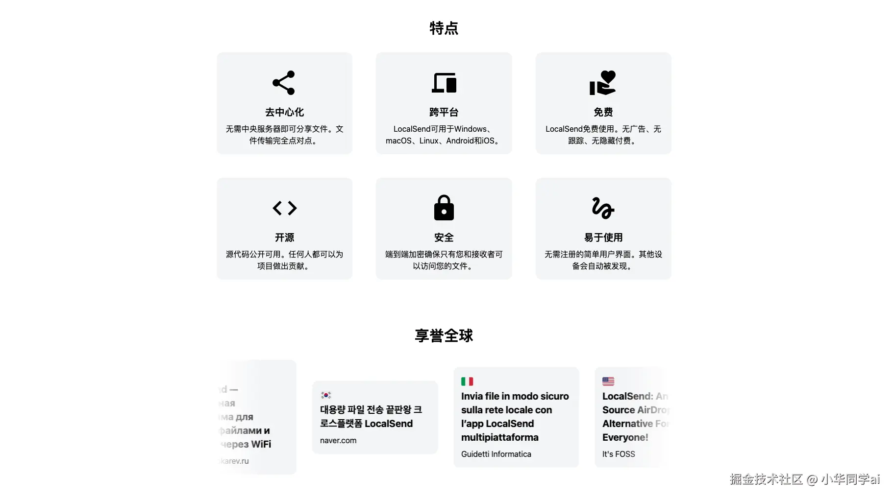 LocalSend是一款开源的文件传输工具,支持在同一网络内的设备间进行高速文件传输。与其他文件传输工具相比,LocalSend具有以下优势: