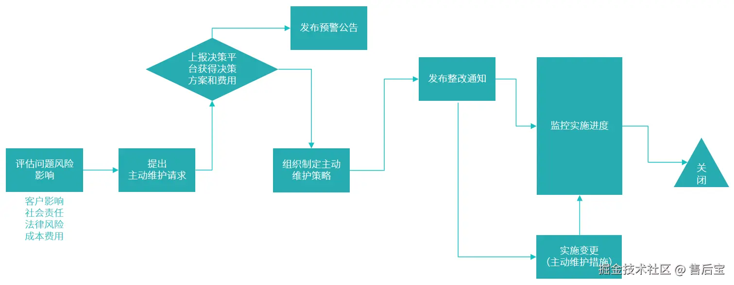 预防性维护(Preventive Maintenance)的触发方式通常是实验室测试,问题在实验室发生、尚未在客户现场出现,但是从技术评估上预测该问题可能在客户现场也会出现,这时企业采取一些主动的措施,进行预警、整改或召回。