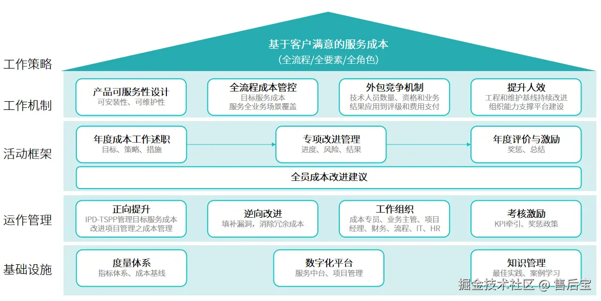 下图是服务成本管控的工作框架,将方法、流程、组织、考核、IT融合在一起。需要明确的是,服务成本的降低一定是基于客户满意的,不能伤害客户满意度。总的来说,大项成本靠机制,包括产品策略、服务策略、外包策略等;小项成本靠文化,需要全员参与、激励牵引、小改进大奖励。
