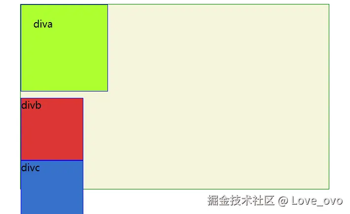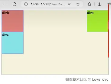 这是因为diva 将 divb 所覆盖住了,所以红色块不显示,但是 由于浮动并不会将文字信息覆盖掉,所以 divb 被挤到 divc 的位置上所显示。